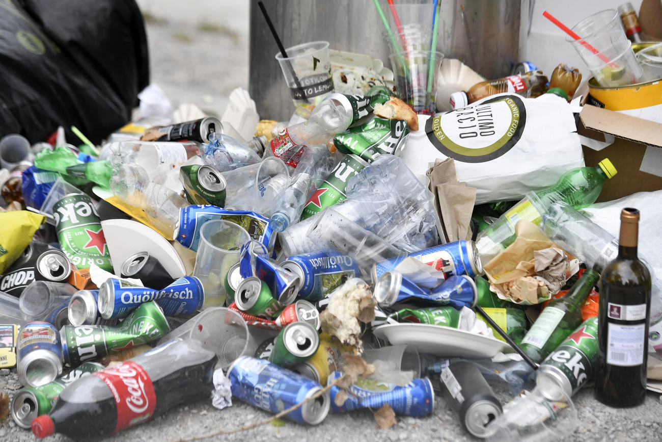 Lauter Wegwerf-Gebinde: Plastikbecher, Alu-Büchsen, Pappteller, insgesamt 250 Tonnen Abfall. Für kritische Fragen zum Anlass sorgte der Veranstalter, weil ausschliesslich Wegwerf-anstatt Mehrweg-Geschirr zum Einsatz kam.