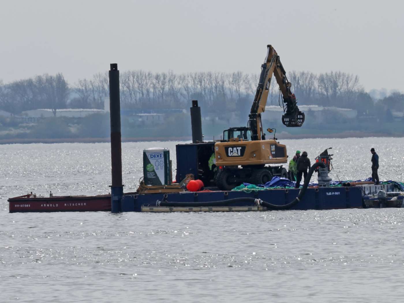 Helfer legten am Samstagmorgen erneut Tücher auf den Rücken des Wals und beobachteten das Tier. Am Nachmittag wurde eine Art grosser Schlauch ins Wasser gelassen. Nach früheren Angaben soll im Bereich des Wals der Untergrund weggespült werden, um das Tier dann mit Luftkissen anzuheben.