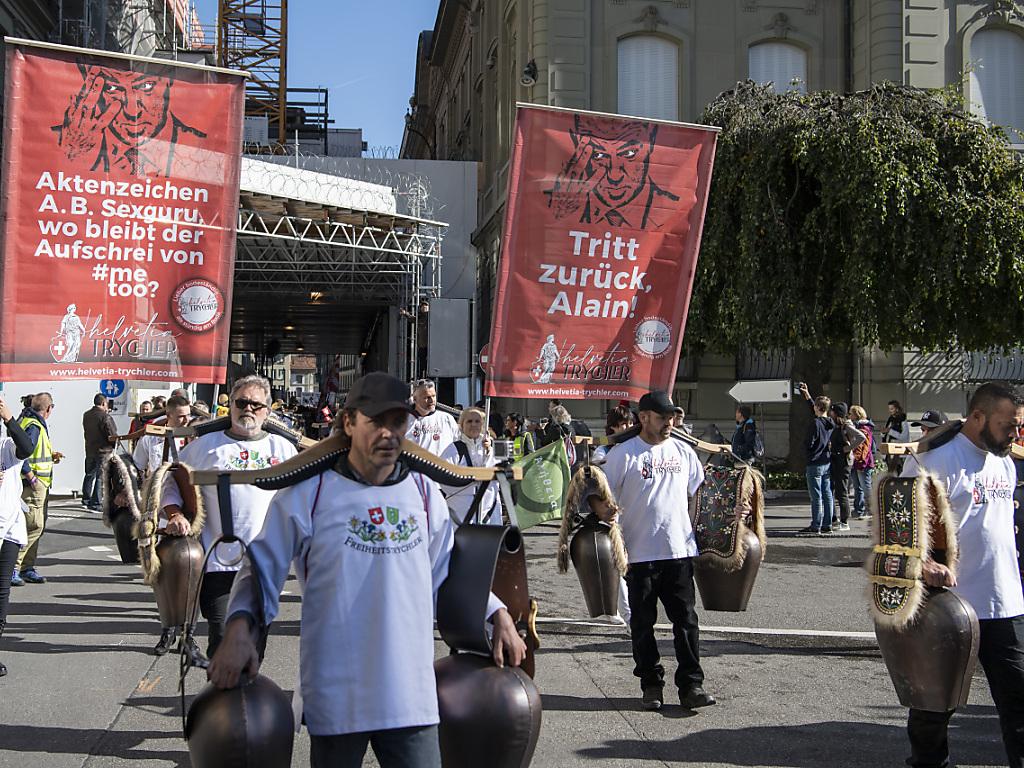 Schon eine Stunde vor Kundgebungsbeginn hatten sich hunderte Menschen auf dem Berner Münsterplatz zur Kundgebung eingefunden. Bald schon konnte der Platz die Teilnehmenden nicht mehr fassen. Um 13.30 Uhr zogen die Demo-Teilnehmenden, angeführt von mehr als hundert Trychlerinnen und Trychlern, auf die vorgegebene Route Richtung Bundesplatz.