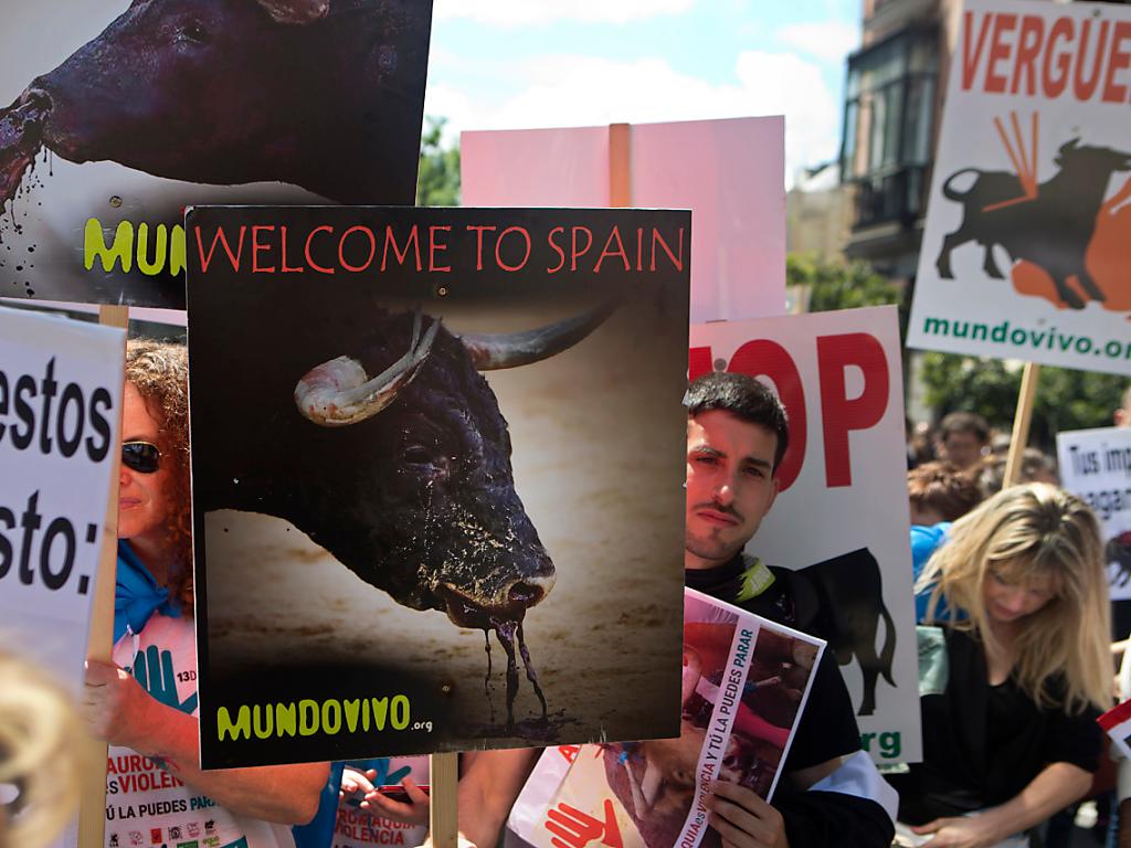 Zum Protest hatten anlässlich des Madrider Volksfestes «Feria de San Isidro» (11. Mai bis 11. Juni), bei dem Stierkämpfe im Mittelpunkt stehen, mehr als 120 Organisationen aufgerufen.