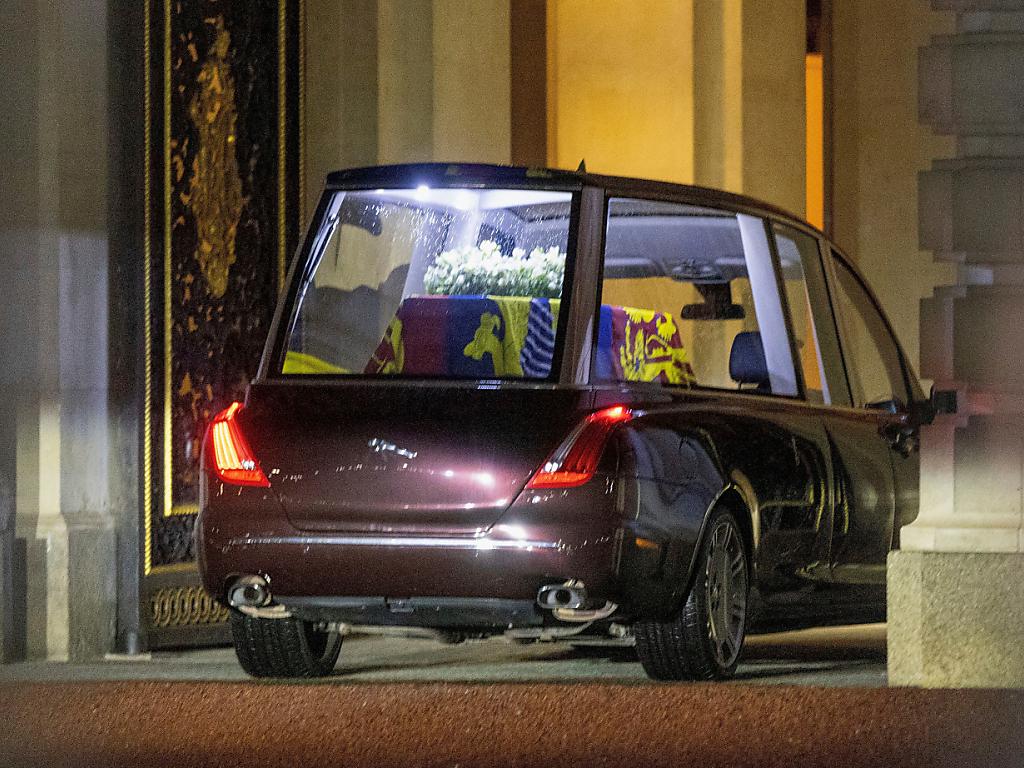 Der Sarg mit den sterblichen Überresten der Queen kam dann am Dienstagabend mit einer Transportmaschine der britischen Luftwaffe von Edinburgh nach London. Er wurde zunächst im sogenannten Bow Room des Buckingham-Palasts aufgestellt.