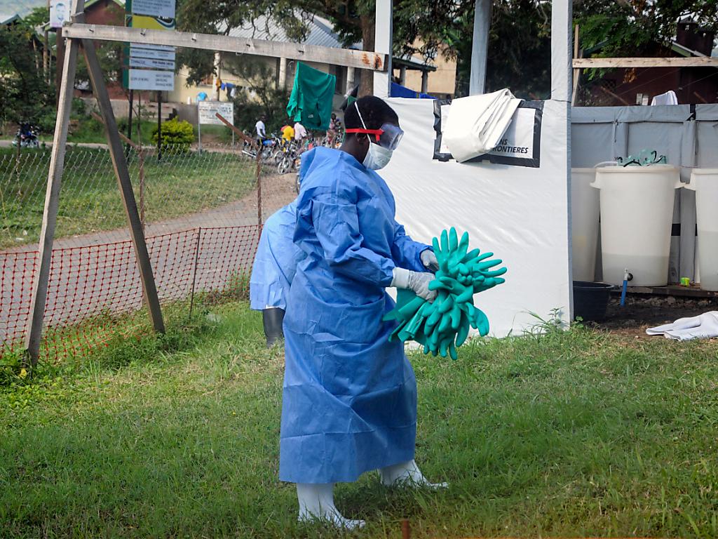 ARCHIV - Ein Mitarbeiter in medizinischer Schutzkleidung trägt Schutzhandschuhe in einem Krankenhaus, in dem ein Ebola-Opfer isoliert wurde. Foto: Ronald Kabuubi/AP/dpa Keystone/AP/Ronald Kabuubi sda-ats