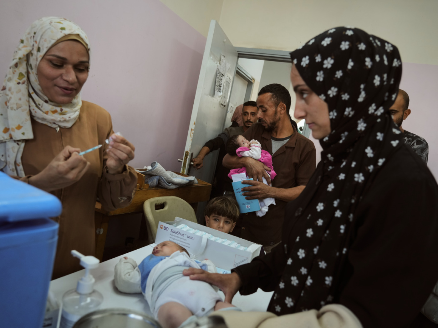 Im Gazastreifen ist eine grossangelegte Kampagne angelaufen, um Kinder gegen verhinderbare Krankheiten wie Polio und Masern zu impfen. Allerdings hänge ein Grossteil der bestellten 1,6 Millionen Spritzen noch an den Grenzen zum von Israel kontrollierten Gazastreifen fest.