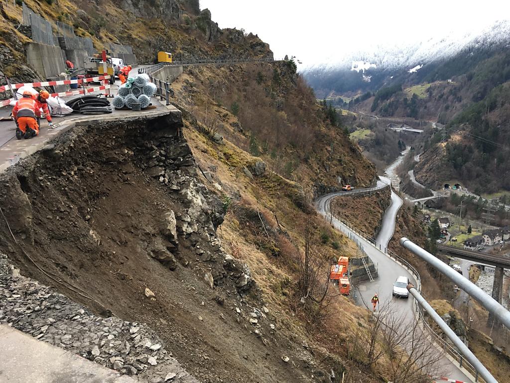 Dank trockener Witterung begannen am Dienstag erste Sicherungsarbeiten im Gelände. Im oberen Teil der Strasse wurden Fels geräumt und freistehende Belagsstücke entfernt. Am Mittwoch soll die Abbruchstelle mit Spritzbeton gesichert werden. Die dazu notwendigen Geräte wie ein Betonsilo und ein Kompressor wurden bereits ins Schadengebiet transportiert.