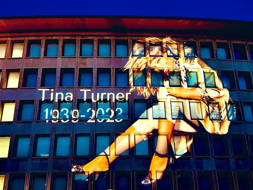Das Bild der Sängerin erstreckte sich auf der Fassade über fünf Stockwerke. Die Projektion sei zu Ehren der «Queen of Rock’n’Roll» schrieb die Botschaft. Sie versah ihren Tweet mit «RIP Tina Turner» – Ruhe in Frieden, Tina Turner.