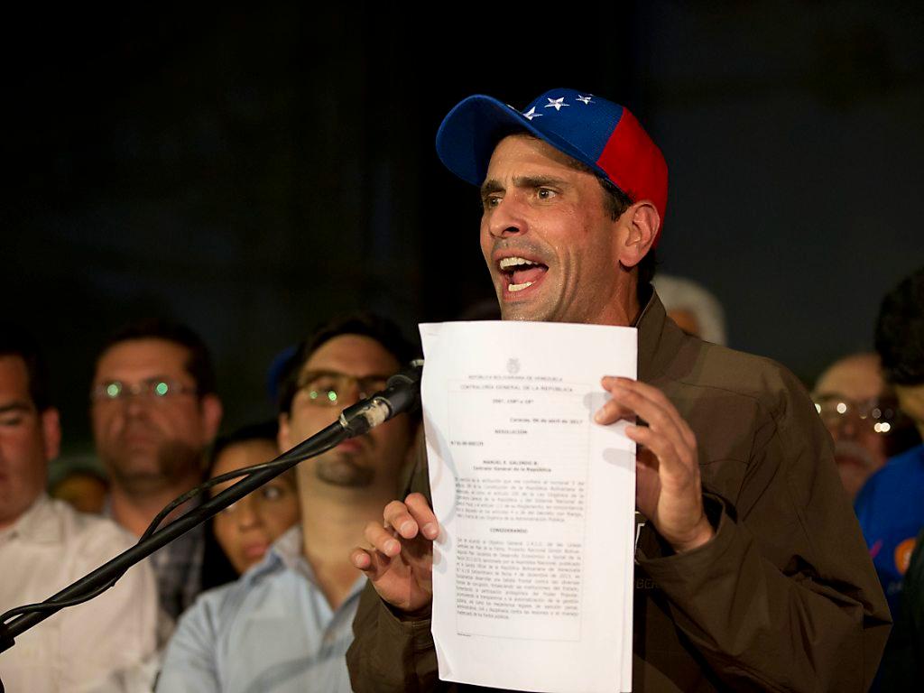 «Nicolás Maduro, sieh Dich vor!», sagte er an die Adresse des Präsidenten. Capriles ist Gouverneur des Bundesstaats Miranda und galt bisher als aussichtsreicher Kandidat bei der Wahl 2018. Im Jahr 2013 hatte er nach dem Tod von Hugo Chávez mit 48,9 Prozent knapp gegen den Sozialisten Maduro (50,8 Prozent) verloren.