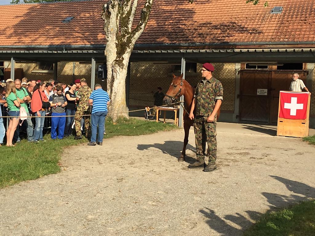 Rund um einen Vorführbereich stellten sich die Leute auf. Kurz nach neun Uhr führte ein Rekrut das erste Pferd aus einem Stall in diesen Vorführbereich.