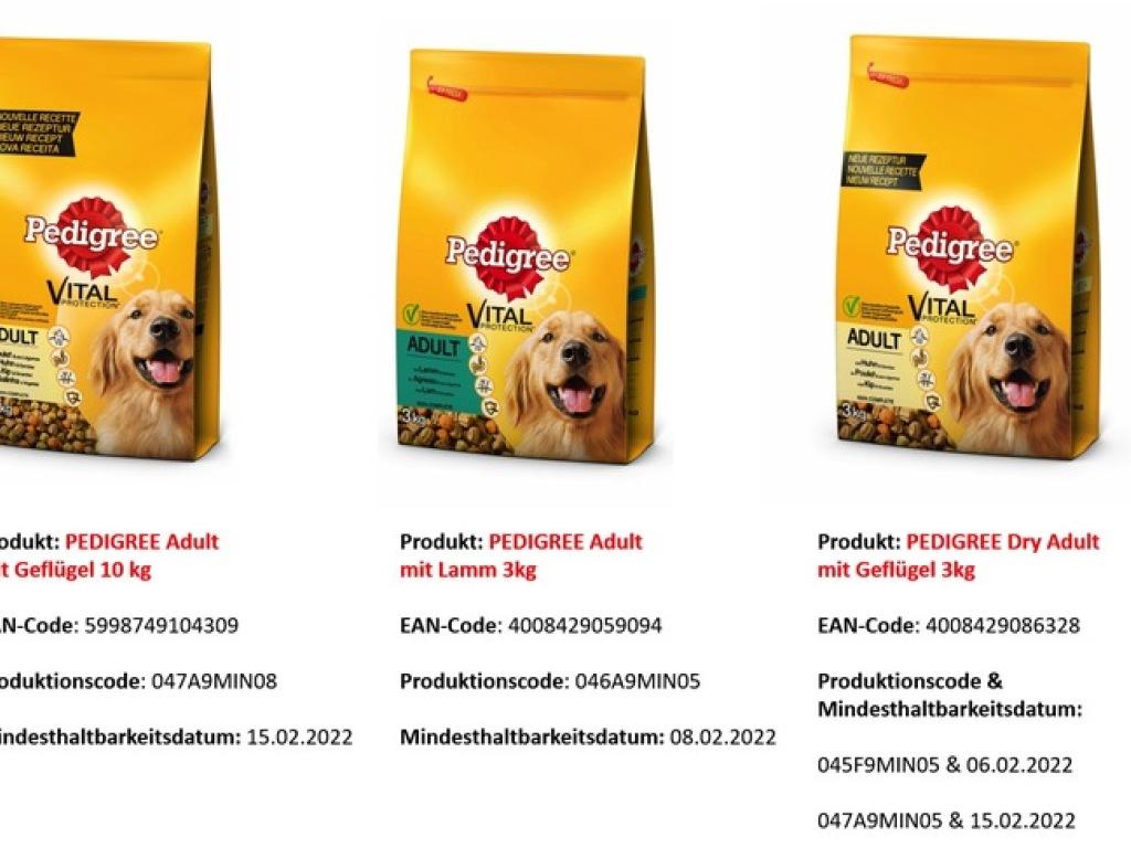 Der Rückruf betrifft Zehnkilo-Säcke «Pedigree» Adult mit Geflügel, die das Mindesthaltbarkeitsdatum 15. Februar 2022 aufweisen. Im weiteren sind Dreikilo-Packungen «Pedigree» Adult Lamm mit Datum 8. August 2022 sowie Adult Geflügel mit den Daten 6. Februar 2022 und 15. Februar 2022 betroffen.