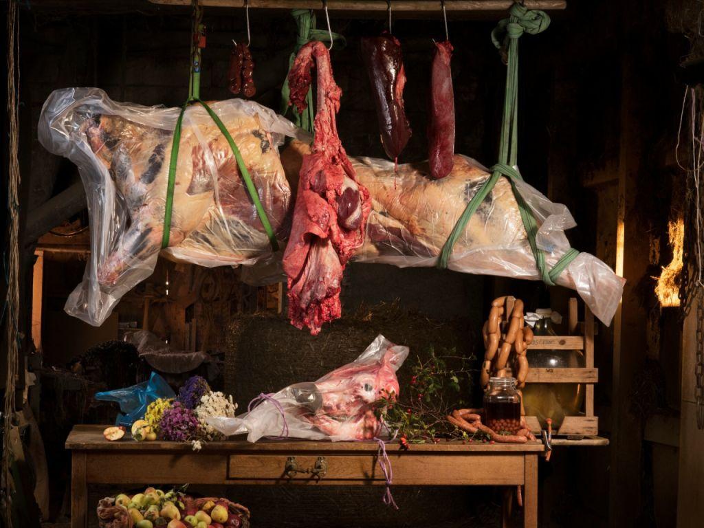 Die künstlerische Inszenierung von Lebensmitteln ist bei weitem nicht neu. Sandra Knechts Stillleben mit Rinderhälfte, Innereien, Obst, Most und Blumen ist denn auch eine Hommage an den Prototypen der Gattung Küchenbild, Pieter Aertsens «Vanitas» aus dem Jahr 1552, in deren Zentrum ebenfalls ein mächtiges Stück Fleisch steht.