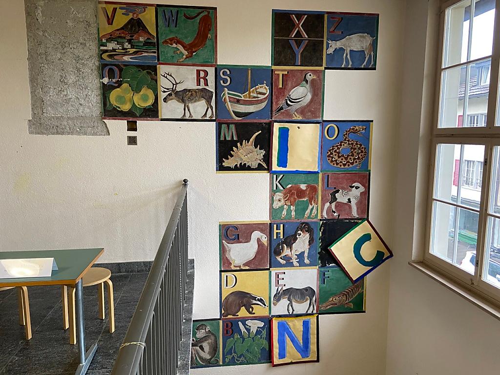 Das Wandbild der Künstler Eugen Jordi (1894-1983) und Emil Zbinden (1908-1991) hing seit 1949 im Schulhaus Wylergut. Es zeigt ein Alphabet, das die Buchstabenfolge mit Tierbildern, einzelnen Pflanzen und Artefakten, aber auch mit drei stereotyp dargestellten Menschen aus Afrika, Asien und Amerika illustriert.