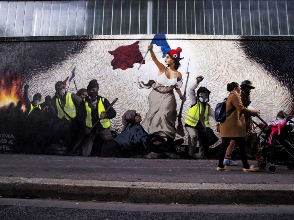 Das Bild ist dem berühmtem Gemälde «Die Freiheit führt das Volk» von Eugène Delacroix nachempfunden, das der Pariser Juli-Revolution gegen den reaktionären König Charles X. im Jahr 1830 huldigt – doch in der modernen Version tragen die Aufständischen gelbe Warnwesten.