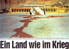 So wird zum Beispiel gezeigt, wie eine Wasserlache vor dem Hatschepsut-Tempel im ägyptischen Luxor nach dem Massaker an Touristen plötzlich zur Blutlache wurde.