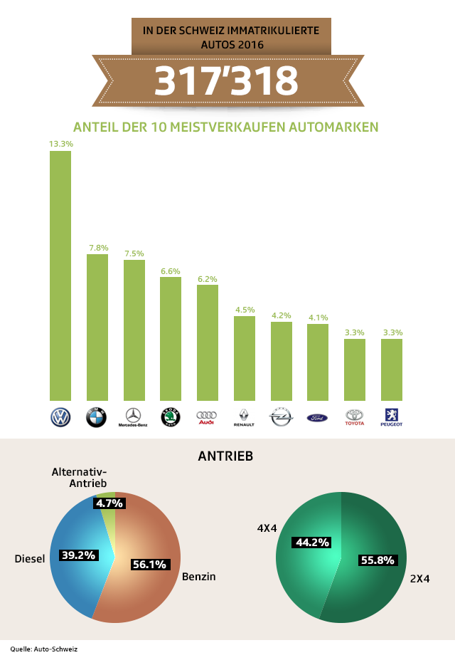 Vier der fünf in der Schweiz und im Fürstentum Liechtenstein 2016 meistverkauften Automarken sind deutsch: Volkswagen, BMW, Mercedes-Benz und Audi gehören zu den beliebtesten Personenwagen, wie eine Auswertung des Branchenverbandes Auto-Schweiz zeigt. 4,7% der 2016 neu immatrikulierten Fahrzeuge verfügten zudem über keinen klassischen Verbrennungsmotor, sondern über alternative Antriebsarten wie Hybridmotor oder Elektroantrieb.