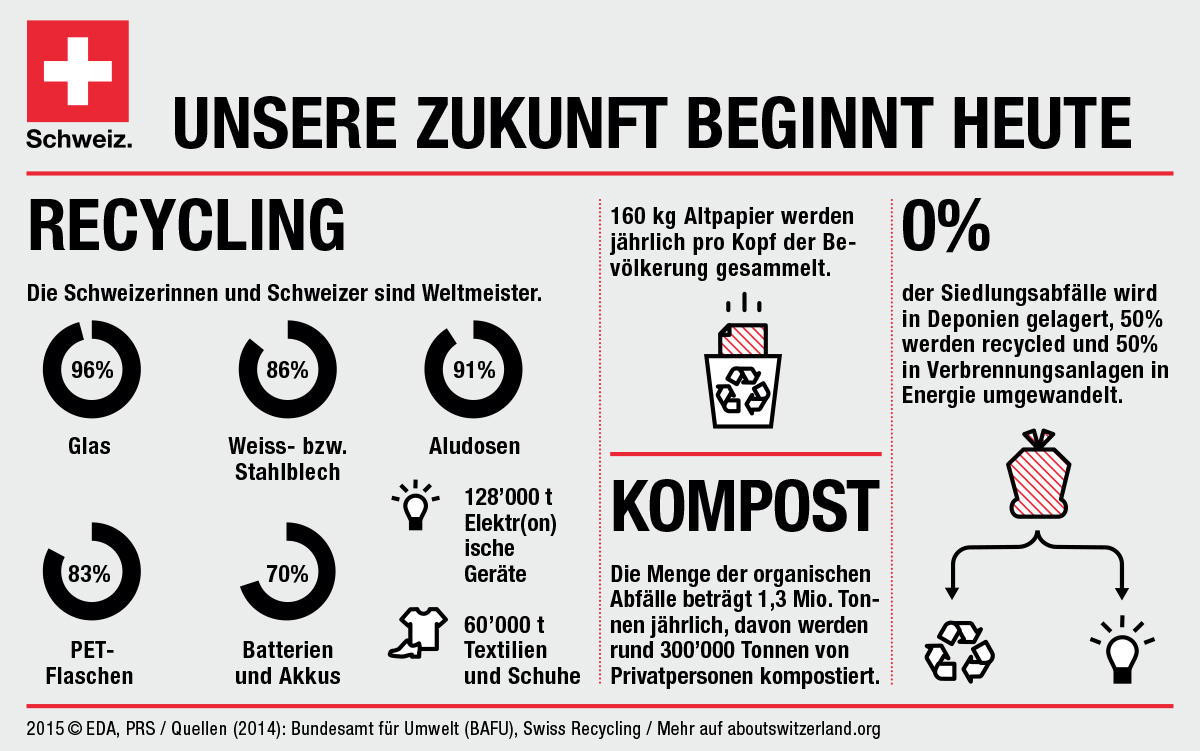 Die Grafik erklärt die Schweizer zum Weltmeister und führt Recyclingquoten von über 90% für Glas und Blechdosen auf. Erstellt wurde sie von Präsenz SchweizExterner Link, einer Institution, die im Auftrag des Departements für auswärtige Angelegenheiten das Image der Schweiz im Ausland fördert.