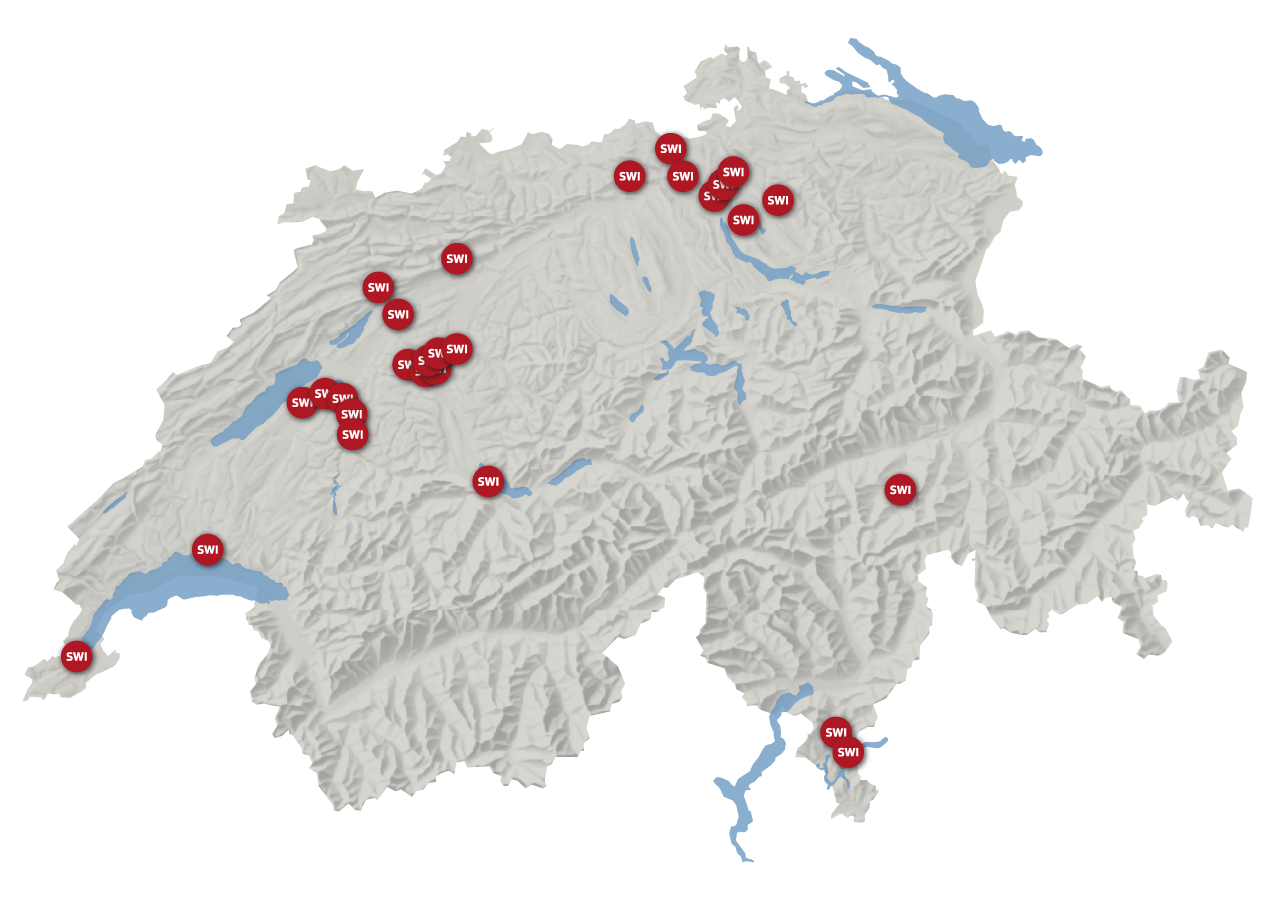 Dieser Inhalt wurde am veröffentlicht Der Lockdown in der Schweiz hat dazu geführt, dass wir Mitarbeitende von SWI swissinfo.ch – von der Direktion über Administration, Marketing und IT bis hin zur Redaktion – im Homeoffice arbeiten. Auch wenn auf der Karte nur gut ein Drittel aller Wohn- und Arbeitsorte eingetragen sind, wird trotzdem ersichtlich, wie verstreut wir im Moment leben…
