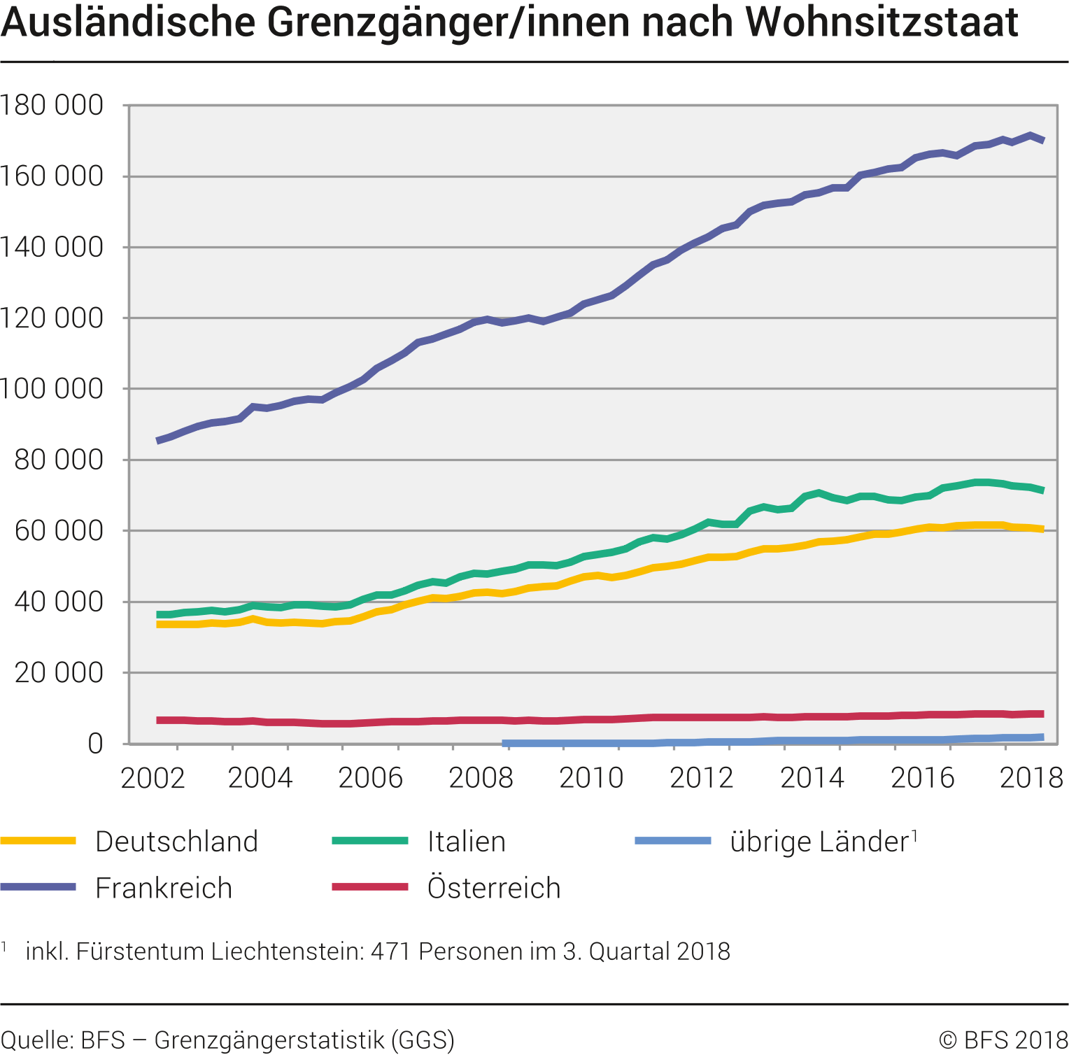 Erstmals seit zwanzig Jahren sank die Anzahl Grenzgänger und Grenzgängerinnen auch im Vergleich zum Quartal des Vorjahres. Das Quartal des Vorjahres ist als Vergleich besser geeignet, weil damit die saisonalen Schwankungen am Arbeitsmarkt auch berücksichtigt werden.