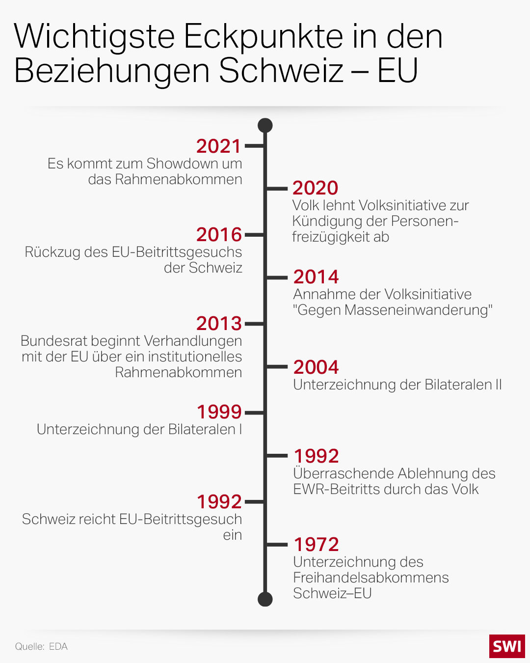 Die Schweiz ist zwar kein Mitglied der Europäischen Union, aber über bilaterale Verträge in den europäischen Wirtschaftsraum integriert. Die EU möchte, dass institutionelle Fragen dieses bilateralen Weges in einem Rahmenabkommen geregelt werden.