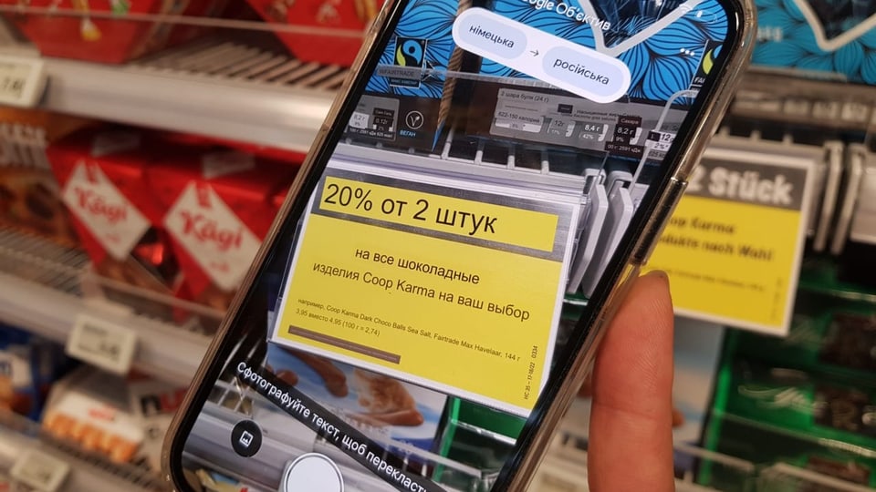 Als Alina Kurdiumova die Kamera auf das Angebot hält, erscheinen dort kyrillische Buchstaben: Der übersetzte Text wird direkt ins Kamerabild eingeblendet.