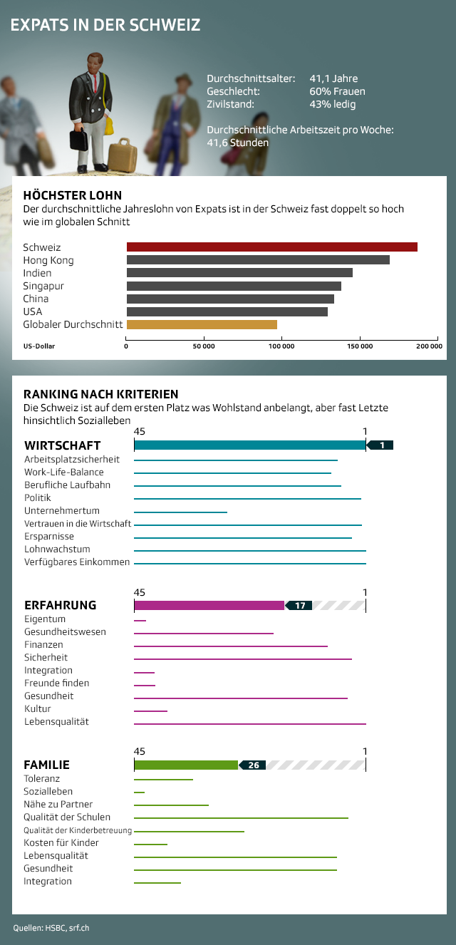 Nirgends werden hochqualifizierte Ausländer auf dem Arbeitsmarkt besser bezahlt als in der Schweiz. Gemäss einer Vergleichsstudie von 45 Ländern durch die internationale Grossbank HSBC verdient ein Expat in der Schweiz fast 190'000 Fr., was etwa das Doppelte des globalen Durchschnitts ist. Das ist aber nur die eine Seite der Medaille: In Bezug auf soziale Faktoren, Lebenskosten und das Familienleben schneidet die Schweiz viel schlechter ab.