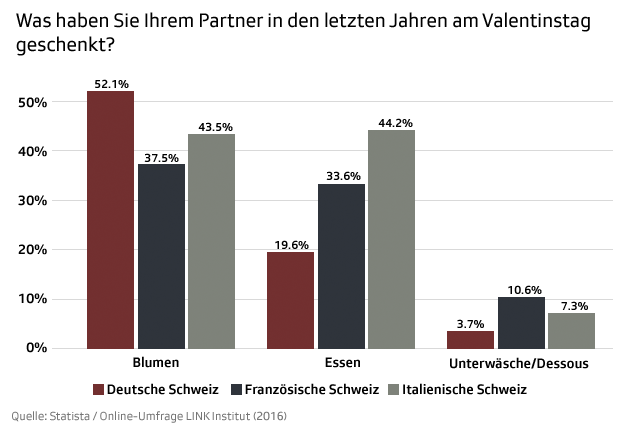 Alles nur Klischees? Dennoch scheinen diese auf die drei Sprachregionen der Schweiz zuzutreffen. So schenken offenbar die meisten Deutschschweizer am Valentinstag ihrem oder ihrer Liebsten Blumen, Essen wird am meisten in der italienischen Schweiz verschenkt und in der Romandie gehen die meisten Dessous über den Ladentisch.