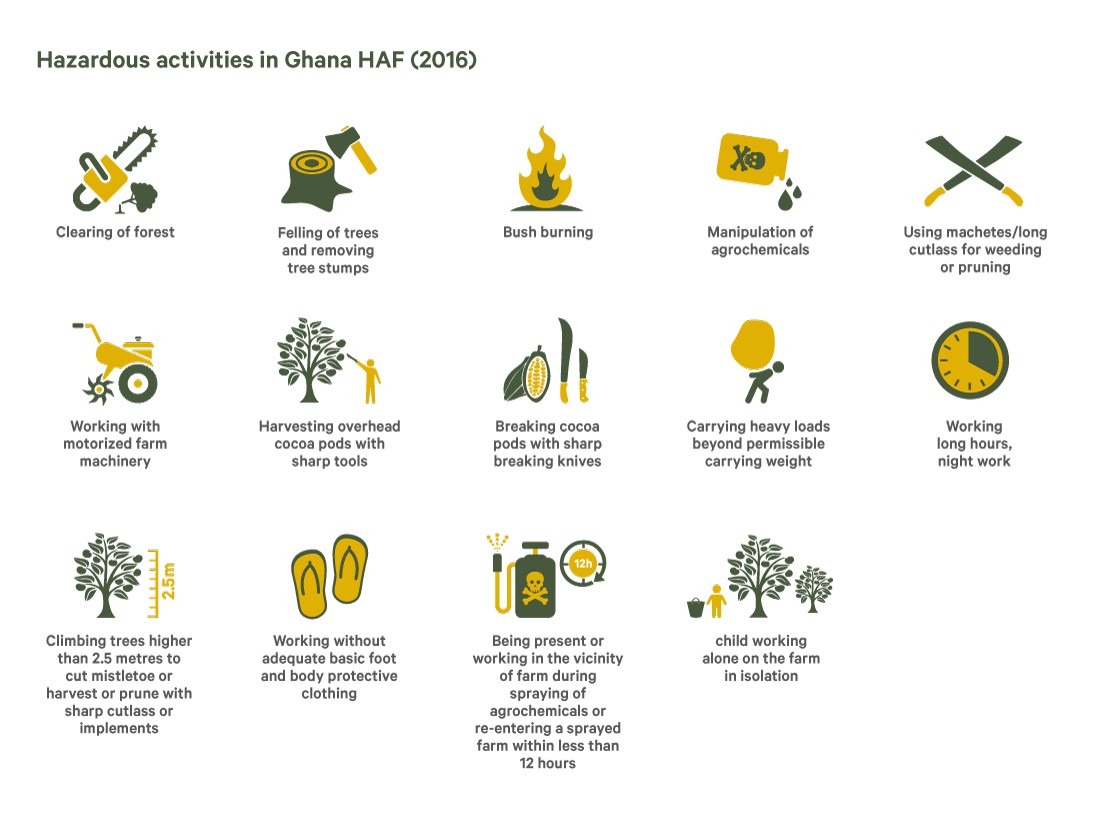 Samuel ist kein Krimineller, aber was er tut, ist illegal. Während seines Tages auf der Farm hat er gemäss der ghanaischen Gesetzgebung gegen Kinderarbeit mindestens drei gefährliche Tätigkeiten ausgeübt: das Ernten von über dem Kopf hängenden Kakaoschoten mit scharfen Werkzeugen, das Aufbrechen von Kakaoschoten mit einem scharfen Messer und das Arbeiten ohne grundlegende Schutzkleidung.