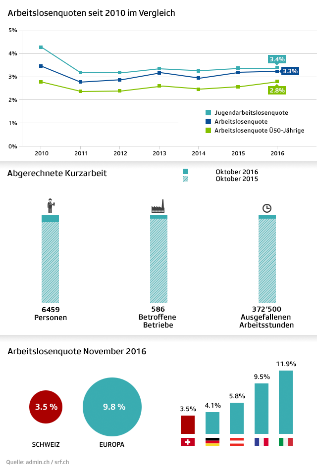 Durchschnittlich 150‘000 Schweizerinnen und Schweizer waren 2016 arbeitslos. Im Vorjahres-Vergleich ist die Arbeitslosenquote damit von 3,2 auf 3,3 Prozent angestiegen. Von Arbeitslosigkeit betroffen sind vermehrt ältere Leute.