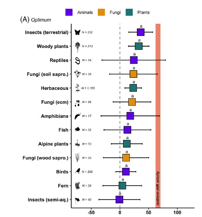 Aber das reicht noch nicht aus, um mit dem Klimawandel Schritt zu halten. Bei anderen Gruppen wie Vögeln, Farnen oder holzzersetzenden Pilzen ist ein viel langsamerer Aufwärtstrend zu beobachten – weniger als 15 Meter Höhenunterschied pro Jahrzehnt.