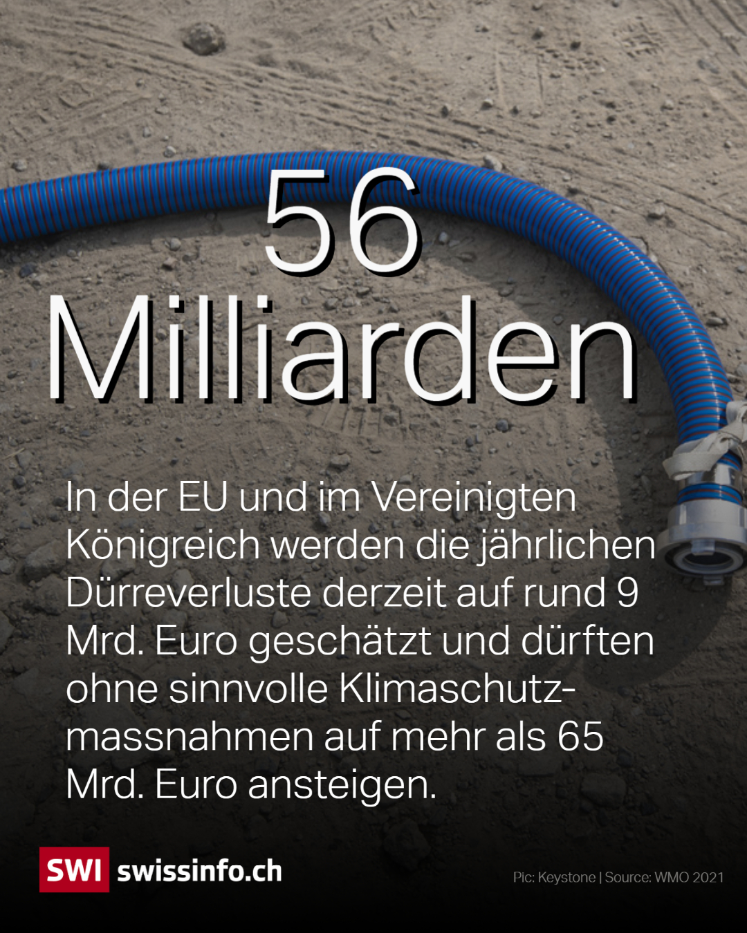 Auch der vom Menschen verursachte Klimawandel erhöht die Wahrscheinlichkeit von Dürren. Die Klimakrise hat die Wahrscheinlichkeit von Rekorddürren in Europa, Nordamerika und Asien im Jahr 2022 um mindestens das 20-fache erhöht, so eine internationale Studie der Eidgenössischen Technischen Hochschule (ETH)Externer Link Zürich.