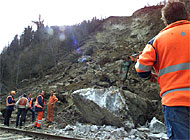 Mindestens indirekt mit den starken Niederschlägen im Zusammenhang stehen die neuerlichen Erd- und Felsrutsche vom Wochenende. Erd- und Gesteinsmassen verschütteten am frühen Sonntagmorgen bei Krattigen am Thunersee die Bahngleise und auch einen Teil der Hauptstrasse A8. Die Strasse war bereits anderthalb Stunden später wieder normal befahrbar. Der Zugsverkehr funktionierte erst am Sonntagnachmittag wieder.