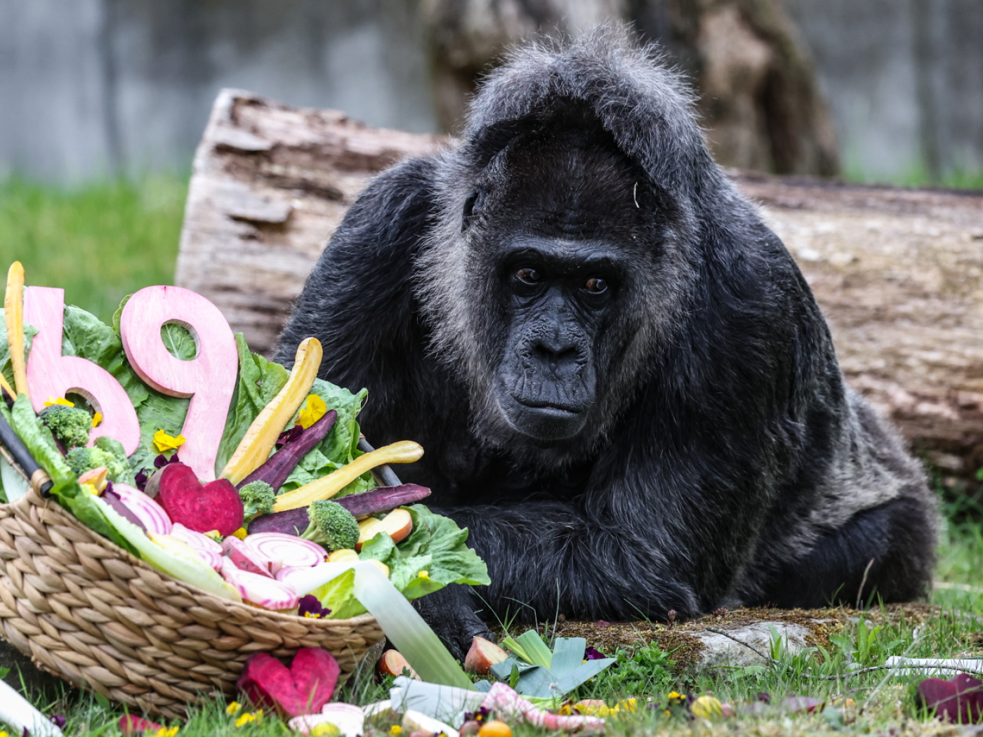 Zu ihrem 69. Geburtstag hat Gorilla-Dame Fatou im Zoo von Berlin eine leckere Überraschung bekommen. Neben einem Bambusstrauss erhielt sie einen Korb gefüllt mit Leckereien wie Salat, Tomaten und Brokkoli. Dem Zoo zufolge gilt Fatou als der älteste Gorilla weltweit.