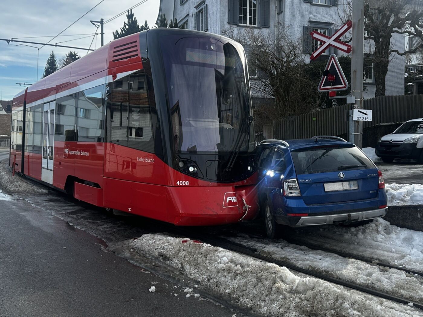 (Keystone-SDA) Eine 65-jährige Frau fuhr mit ihrem Auto rückwärts über die Gleise in Richtung Hauptstrasse, wie die Kantonspolizei Appenzell Ausserrhoden am Freitag in einer Mitteilung schrieb. Gleichzeitig fuhr eine Zugkomposition der Appenzeller Bahnen mit Ziel St. Gallen um eine Kurve. Obwohl der Zugführer eine Notbremsung einleitete, kam es zur Kollision.