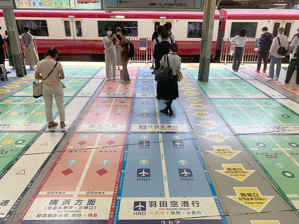 Japans Liebe zu Regeln und Vorschriften kann bisweilen skurrile Formen annehmen. So sind die Bodenmarkierungen für die Warteschlangen auf dem Bahnhof Shinagawa derart bis ins letzte Detail durchorganisiert und die Warteschlangen für die Züge grossflächig und farbenfroh so gestaltet, dass nicht nur Touristen schon mal die Übersicht verlieren können.