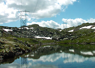 Acqua e tralicci dell’alta tensione presso il Passo della Novena. Sembra già di intuire dove andrà a finire l’acqua che sgorga dalle montagne della Val Bedretto.