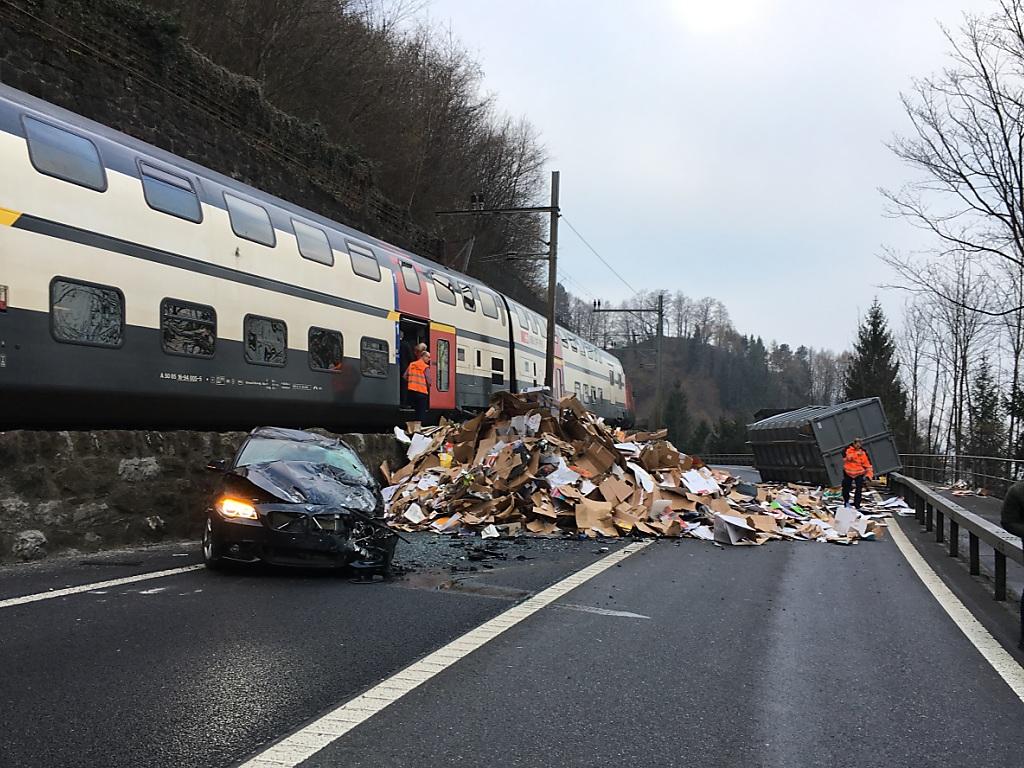 Spettacolare incidente questa mattina sull’A8 nell’Oberland bernese: un camion ha perso un container carico di cartone, che è stato prima urtato da un’auto proveniente in senso inverso e successivamente è finito su un binario ferroviario tra Leissigen e Spiez. Un treno di passaggio ha colpito a sua volta il container facendolo ritornare sulla carreggiata.