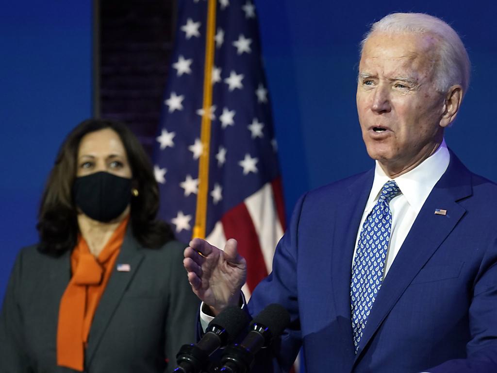 Joe Biden sale con Kamala Harris sul palco del Queen Theatre della sua Wilmington dopo aver nominato la sua task force anti-Covid e frena gli entusiasmi con cui le Borse e l’opinione pubblica mondiale hanno accolto l’annuncio della Pfizer sul successo del suo vaccino.
