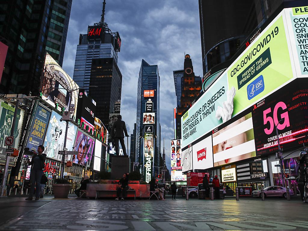 Un'immagine insolita di una Times Square semivuota. KEYSTONE/AP/John Minchillo sda-ats