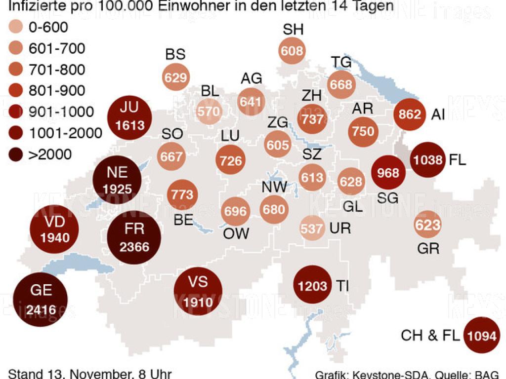 L’incidenza della malattia ha raggiunto i 3’122,97 casi ogni 100’000 abitanti oggi e 1’036,13 casi ogni 100’000 abitanti negli ultimi 14 giorni. Venerdì quest’ultimo dato era pari a 1’094,22/100 mila abitanti.