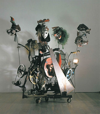Jean Tinguely, (1925-1991) "L'Avant-Garde", 1988, Metallo, maschere di cartapesta, cinghie, ruote in legno e motori elettrici