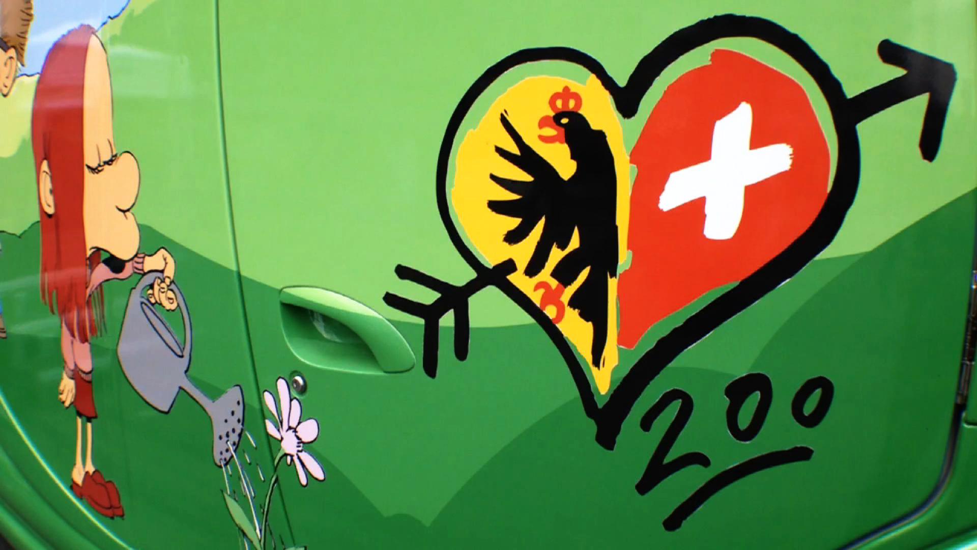 Nell’aria si sente odore d’estate. E dalla fiancata del bus emana un effluvio d’amore. Un galante cittadino ginevrino è inginocchiato davanti a un’avvenente Helvetia. Sullo sfondo, il famoso getto d’acqua è a forma di cuore.