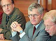 Il ministro delle finanze Kaspar Villiger tra il consigliere di Stato bernese Hans Lauri (a destra) ed il direttore dell'Amministrazione federale delle finanze Peter Siegenthaler Keystone