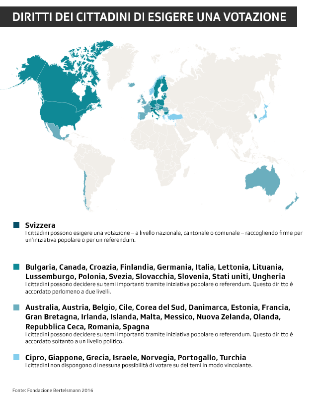Per la prima volta un istituto internazionale indipendente, la fondazione tedesca BertelsmannCollegamento esterno, ha paragonato i diritti popolari di democrazia diretta accordati in 41 Stati membri dell’Organizzazione per la cooperazione e lo sviluppo economico (OCSE) e dell’Unione europea (UE).