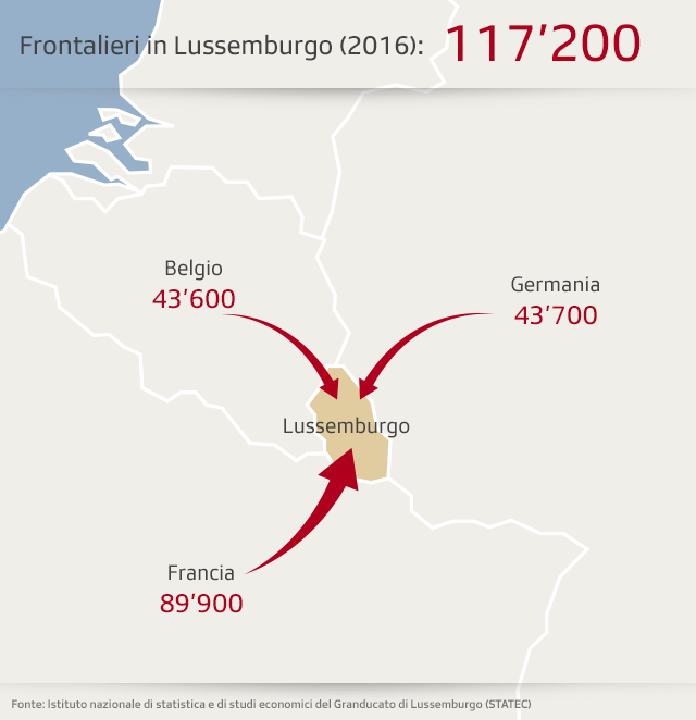 Nel più piccolo degli Stati fondatori dell’Unione europea, circondato da Germania, Belgio e Francia, i lavoratori frontalieri (quasi 180’000) costituiscono il 45% del totale della forza lavoro locale.