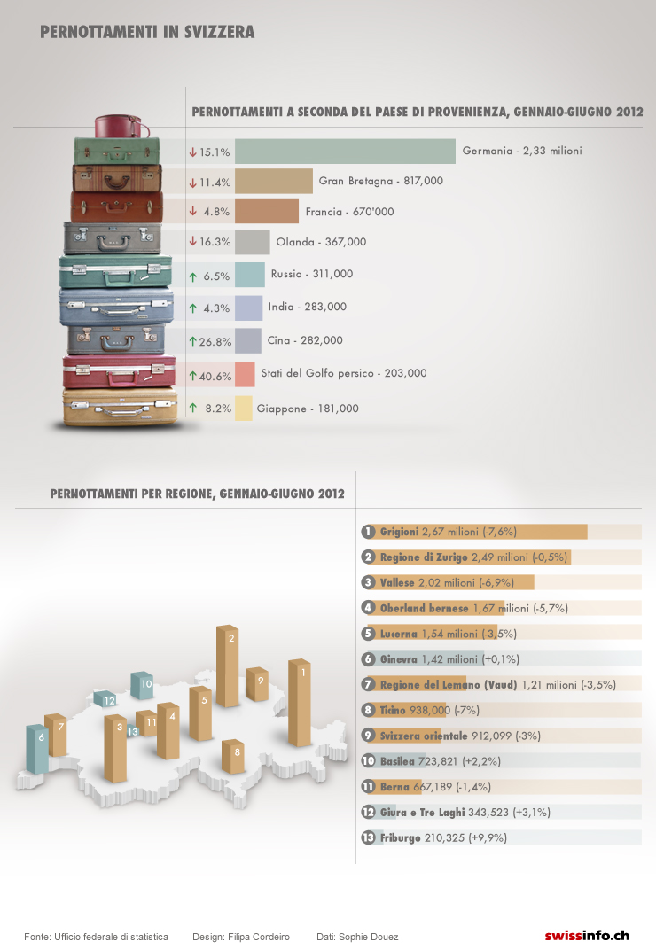 I tedeschi sono tradizionalmente i più grandi frequentatori degli alberghi svizzeri. Complice il franco forte, l’afflusso di turisti dalla Germania e dagli altri paesi europei ha però subito un forte calo nella prima parte del 2012.