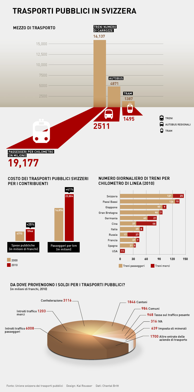 La Svizzera ha una delle reti ferroviarie più dense al mondo. Ogni giorno in media 121 treni passeggeri transitano su ogni chilometro di linea. Tutto ciò ha però un costo: ogni anno sono investiti oltre 5 miliardi di franchi dei contribuenti nei trasporti pubblici.