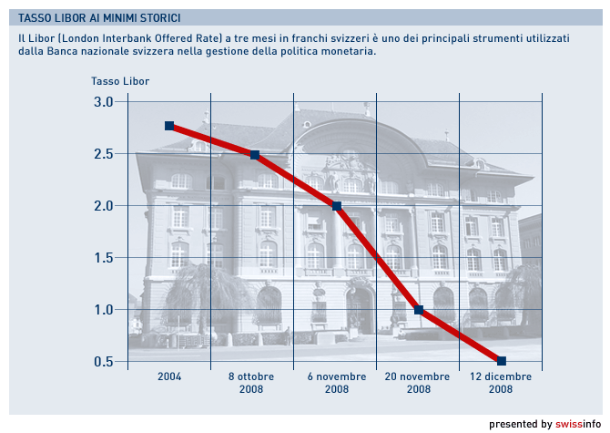 Per far fronte alla crisi e ridare fiducia ai mercati, giovedì la Banca nazionale svizzera (BNS) ha deciso ai abbassare di un altro mezzo punto il suo tasso direttore. L'istituto di emissione prevede che la recessione colpirà l'economia svizzera per tutto il 2009.