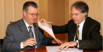 Il ministro svizzero dell'ambiente Moritz Leuenberger (a destra) durante la firma della convenzione con il presidente degli importatori svizzeri di automobili Tony Wohlgensinger Keystone
