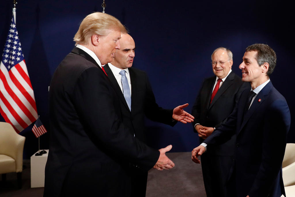 Il presidente della Confederazione Alain Berset presenta i ministri svizzeri degli affari esteri, Ignazio Cassis, e dell'economia, Johann Schneider-Ammann, al presidente degli Stati Uniti Donald Trump. (Keystone)