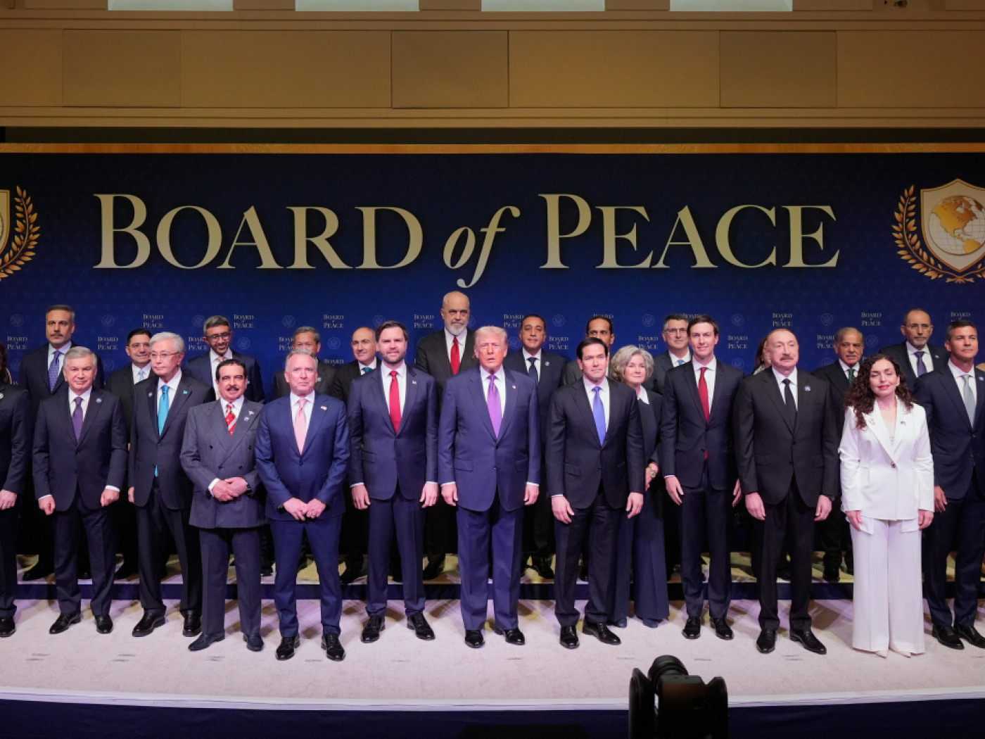 Donald Trump, JD Vance, Marco Rubio, la chief of staff della Casa Bianca Susie Wiles, Jared Kushner, l'inviato speciale Steve Witkoff e gli altri rappresentanti del Board of Peace hanno posato per la foto di famiglia al primo incontro del gruppo a Washington.