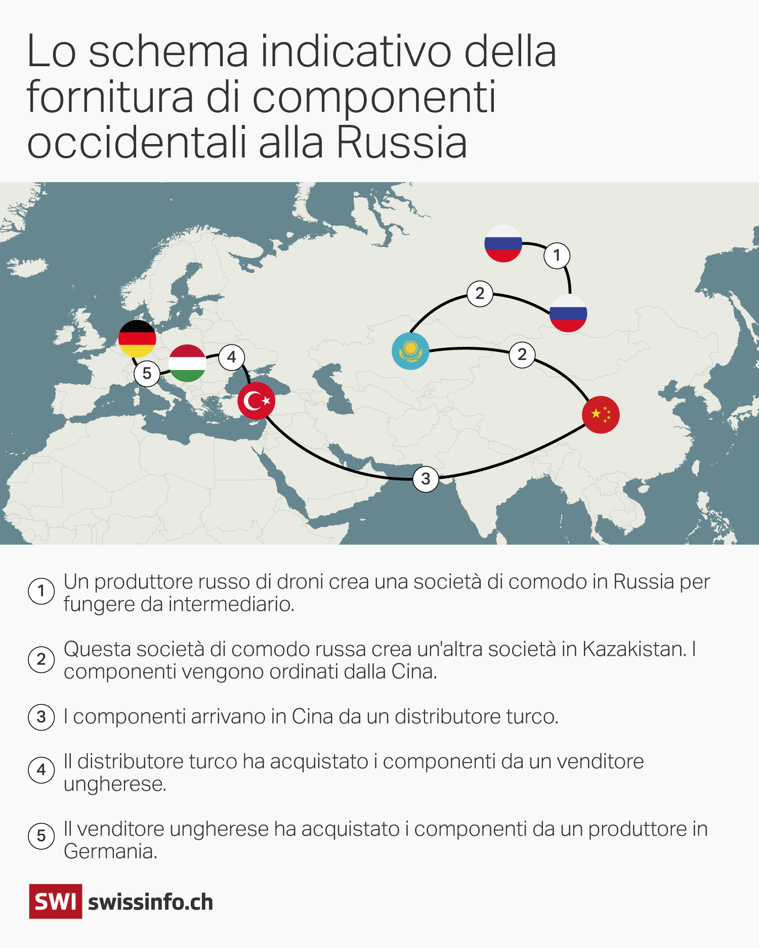 Si pone quindi la questione di quali aziende stiano aggirando le sanzioni per vendere componenti di provenienza estera alla Russia e in che modo. L’Unione Europea e gli Stati Uniti sono stati molto rapidi nel sanzionare persone e beni russi fin dall’inizio della guerra. La Svizzera ne ha seguito subito l’esempio. Per impedire alla Russia di aggirarle, la Confederazione ha aderito all’undicesimo pacchetto di sanzioni promulgato dall’Unione Europea nell’agosto 2023. Tra queste c’è il divieto di esportare prodotti a duplice uso (civile e militare) e beni che possano contribuire al potenziamento tecnico-militare della Russia. Le restrizioni sono applicate a 87 aziende, comprese quelle che rifornivano la Russia da Paesi terzi.