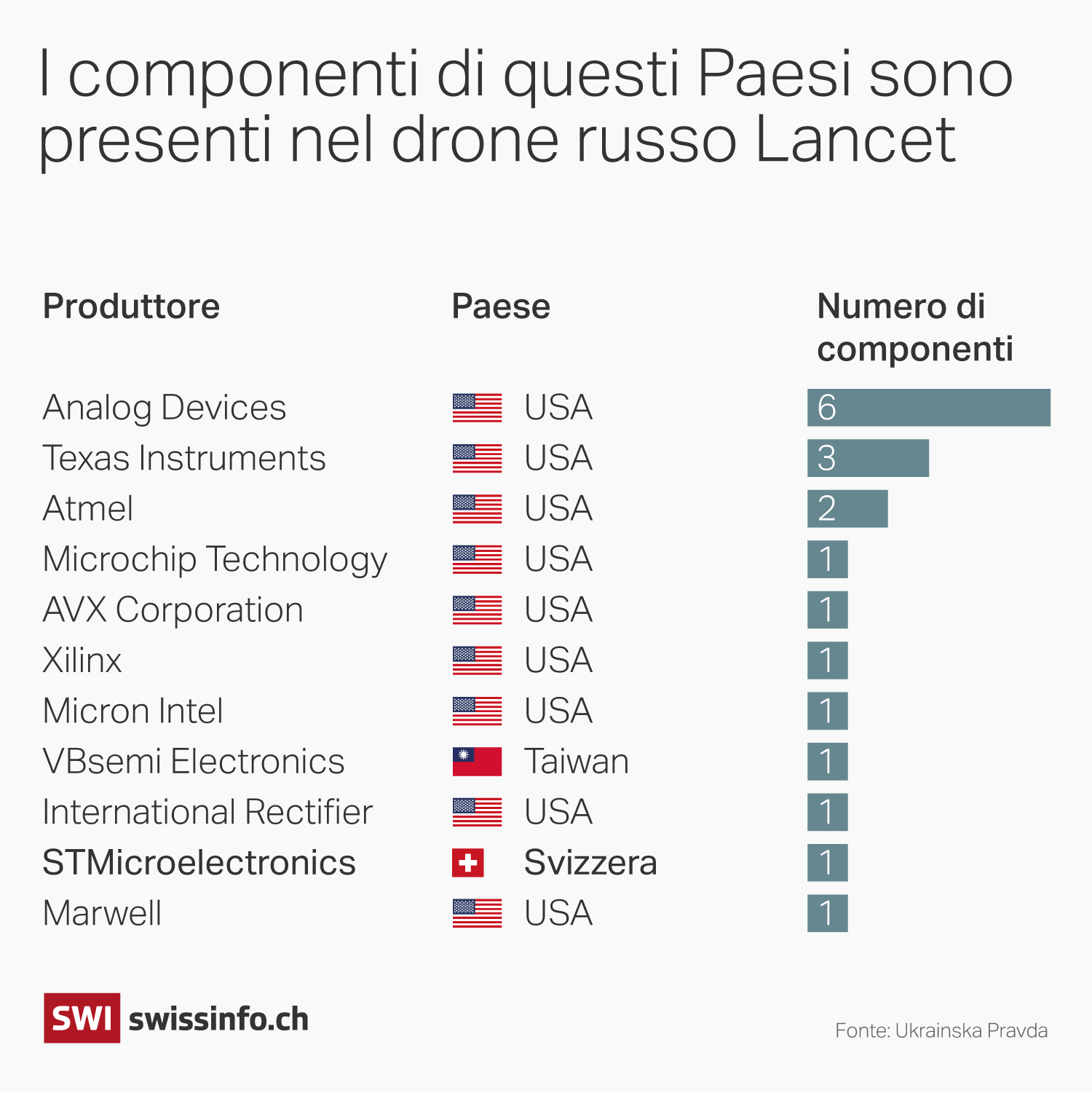 Nell’analizzare le informazioni ricevute, SWI ha scoperto che nei droni Lancet sono stati identificati almeno 19 componenti elettronici di fabbricazione straniera. Tra le aziende citate compaiono due società svizzere, STMicroelectronics e u-blox, entrambe erano già menzionate anche in altri rapporti pubblicati da think-tank in Ucraina e nel Regno Unito.